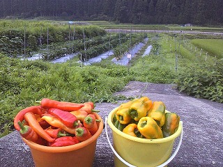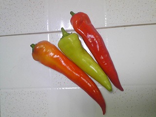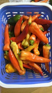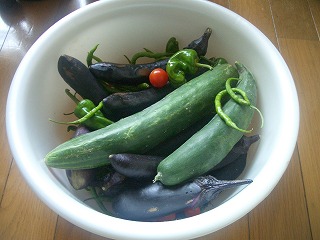 かろうじてこんなものが採れました ミニトマト キュウリ ナス ピーマン ヒモトウガラシ |